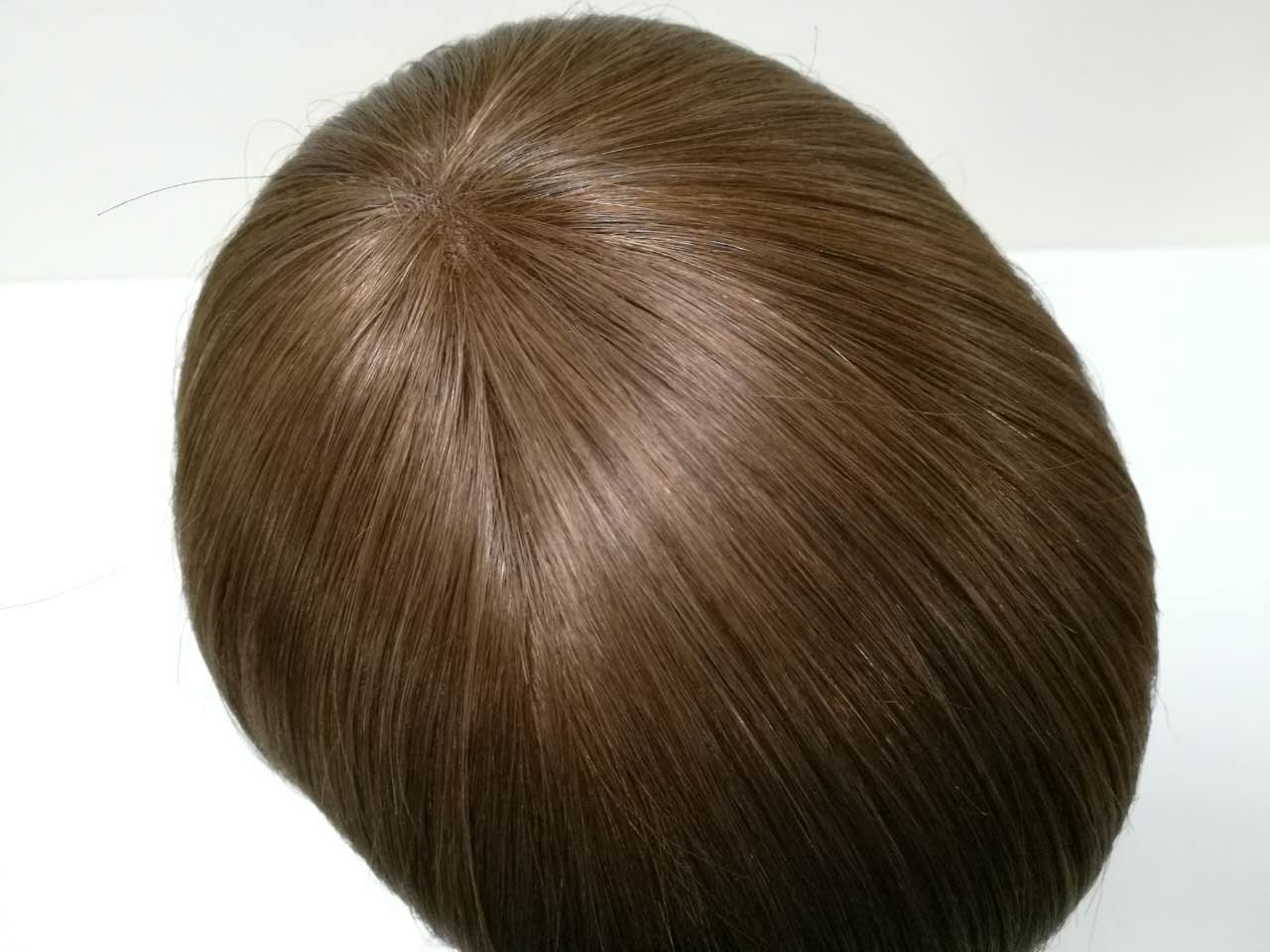 这款定制女士假发的法式蕾丝底座轻盈、透明、透气。 因此,它创造了一个自然、耐用和通风的基础。 弹力网使女士人发假发易于佩戴,并能很好地贴合头部。 根据客户的要求,我们在两个镜腿上都放置了金属支架,以防止边缘卷起。 折叠花边正面使正面自然。